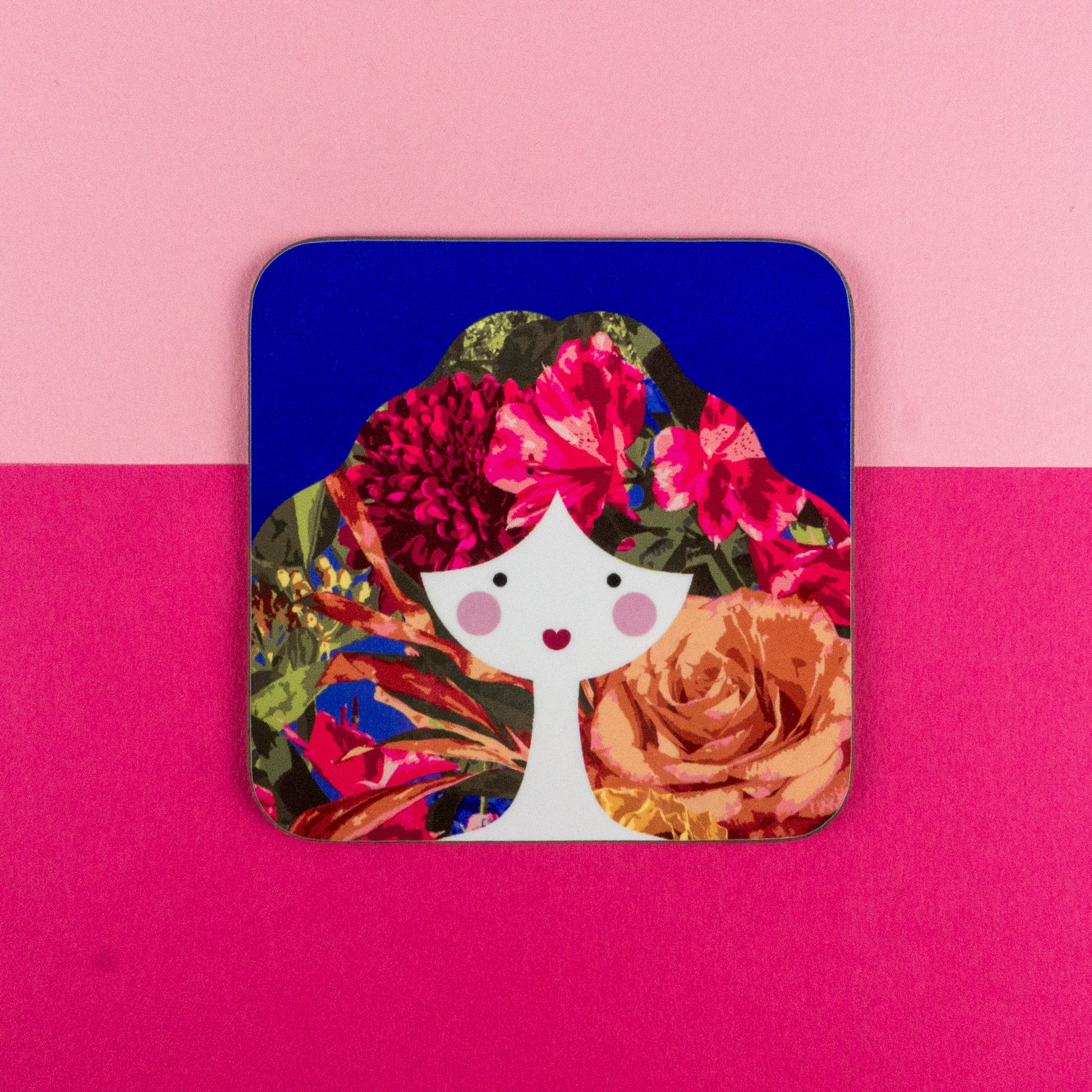 Add a pop of colour with this blue and pink floral lady, featuring beautiful flowers and a geometric retro illustration of a lady.
