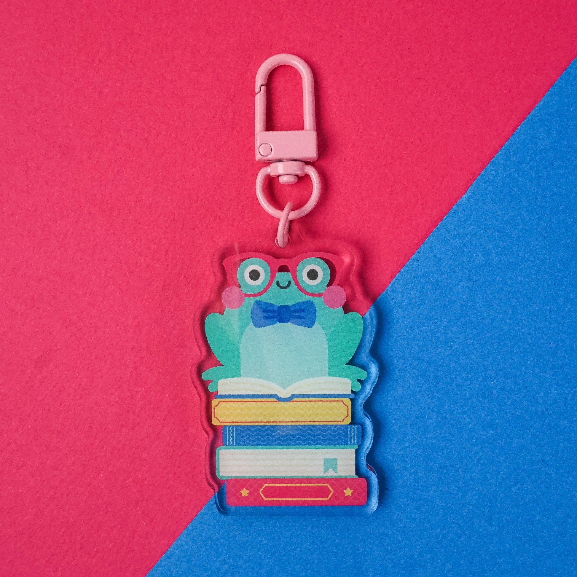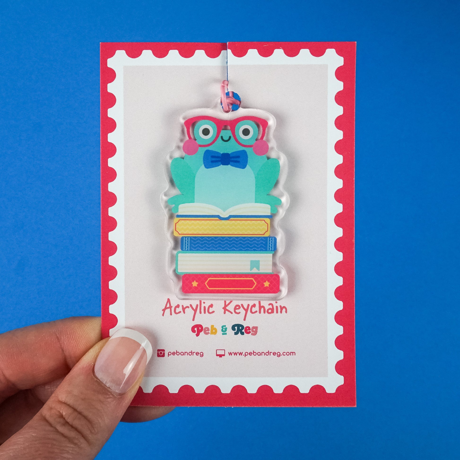 This Reading Frog keyring is crafted from clear acrylic plastic, with a gloss finish and a matte pink keychain. The artwork is doubled-sided, backed with a white layer to ensure it is not see-through, then sandwiched between two layers of acrylic for protection against scratches.