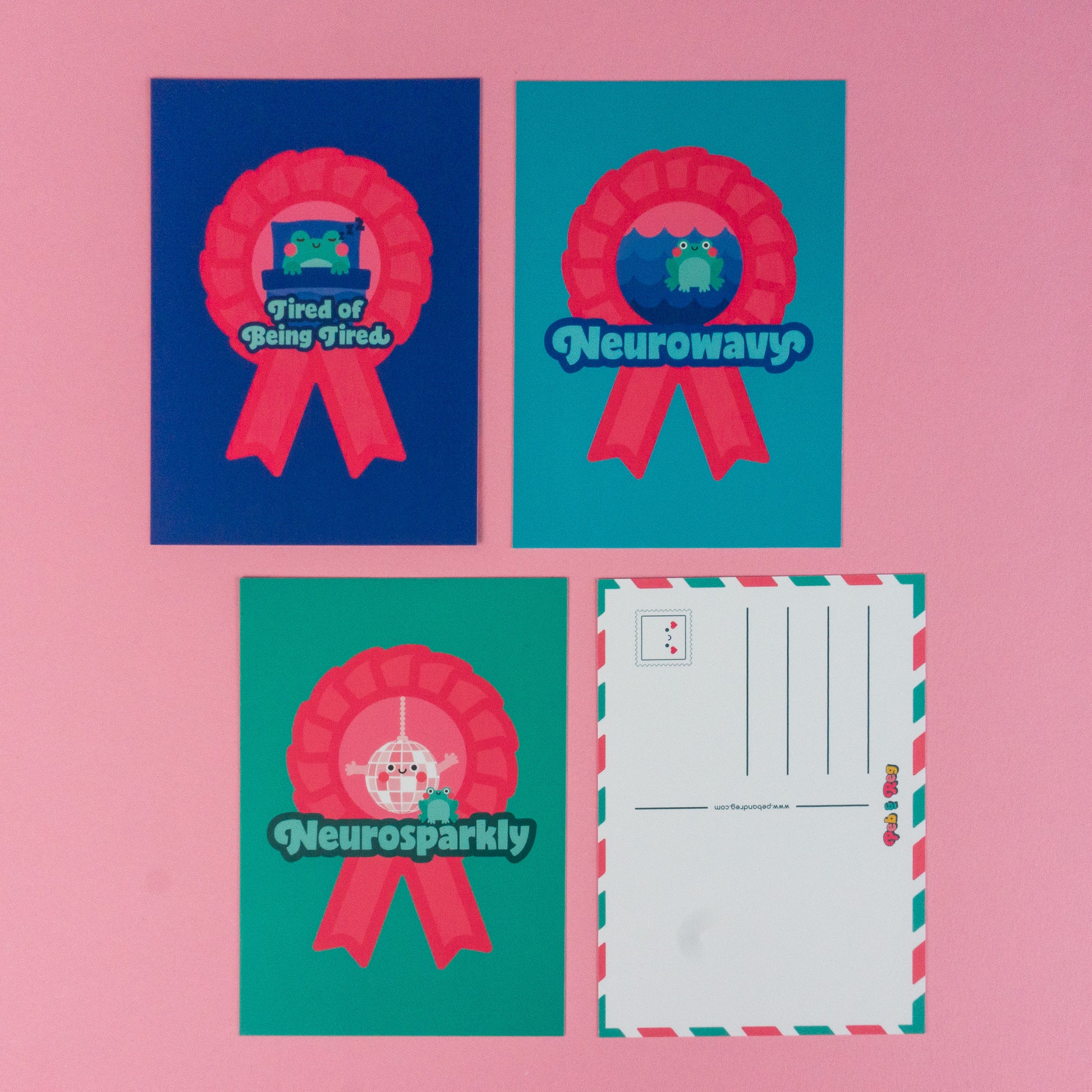 This listing is for four neuro rosette postcards: neurospicy, neurowavy, neurosparkly and tired of being tired.